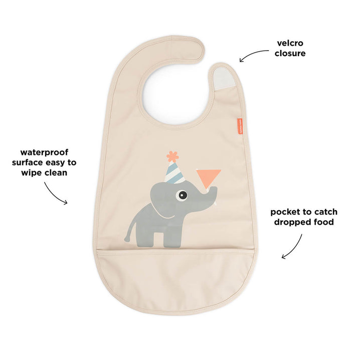 Babete com velcro da Coleção Celebration da Done by Deer, babete impermeável, prático e resistente para uso diário do seu bebé. Feito com tecido suave e de fácil limpeza, este babete irá com o seu bebé para todo o lado, babete contem um bolso que apanhará qualquer comida que possa cair. O simples fecho de velcro facilita a colocação da babete.