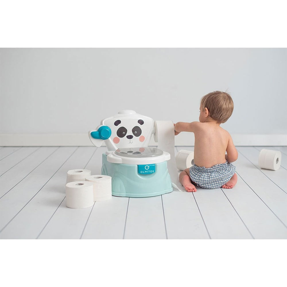 Bacio Mini Sanita Original Panda da Olmitos, um simpático bacio com padrão Panda para bebés, para os incentivar a usarem o bacio, imitando os pais, ao utilizarem a sua própria sanita, tal como os adultos.