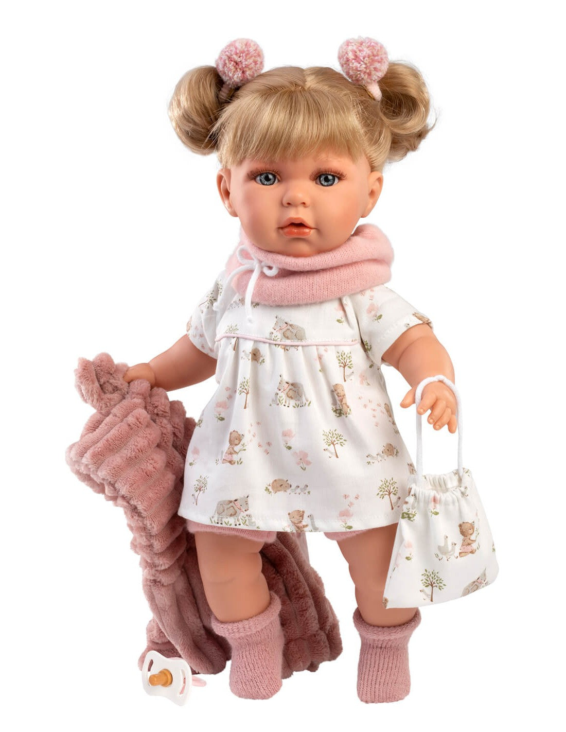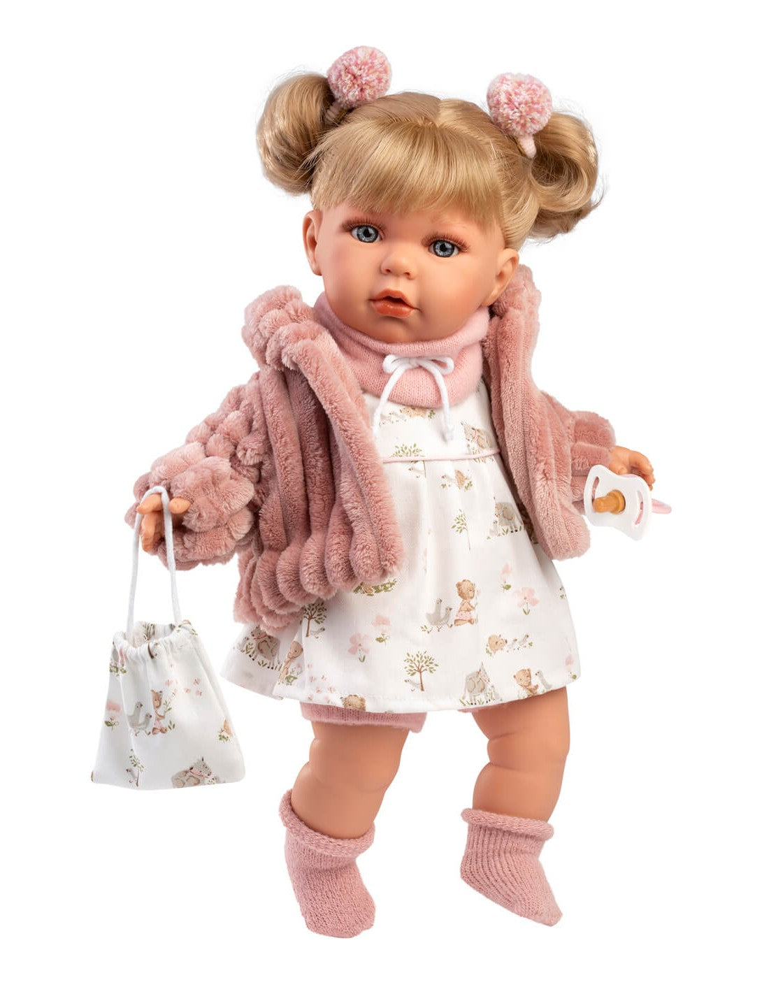Boneca chorona Julia da Llorens com 42cm. Emite sons realistas de choro, ideal para brincadeiras de faz de conta.