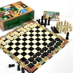 Jogo de Xadrez e Damas, com peças em madeira e livro de instruções.