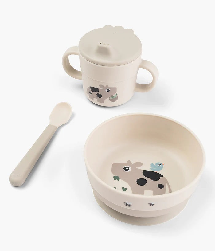 Conjunto de papa da colecção Tiny Farm da Done by Deer, um simpático conjunto para os mais pequenos iniciarem a ser mais autónomos da hora da refeição. Conjunto composto por taça com ventosa antiderrapante e impressão no fundo com animais da quinta, copo  de aprendizagem e colher.