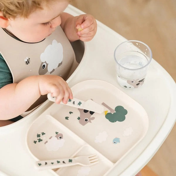 Prato com divisórias da colecção Tiny Farm da Done by Deer, ideal para o seu pequenote iniciar a ser mais autónomo durante as refeições. Separar a comida ajudará o seu filho a sentir e compreender diferentes sabores e texturas. Divida o jantar do seu filho e deixe cada compartimento manter a comida no lugar. Prato com laterais altas ajudarão o seu filho a agarrar na comida, enquanto a prática base antiderrapante garante que o prato fique no lugar. Projetado para o dia a dia com crianças e pode ser lavado na lava-louças e utilizado no micro-onda