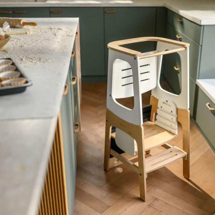 Fácil de utilizar: tanto pelos pais como pelas crianças. Transitar entre modos é simples: uma rotação rápida da Toucan transforma a torre de aprendizagem num conjunto de mesa e cadeira. Quando a criança já anda, e a torre de aprendizagem se tiver a tornar desadequada para o seu desenvolvimento, pode desmontá-la e transformá-la numa mesa e banco. O design versátil 3 em 1 da Toucan, permite que a criança realize uma série de tarefas autonomamente, desde aceder às bancadas da cozinha a escovar os dentes. Para os pais, manter a Toucan limpa é fácil, graças ao seu acabamento protetor e impermeável.