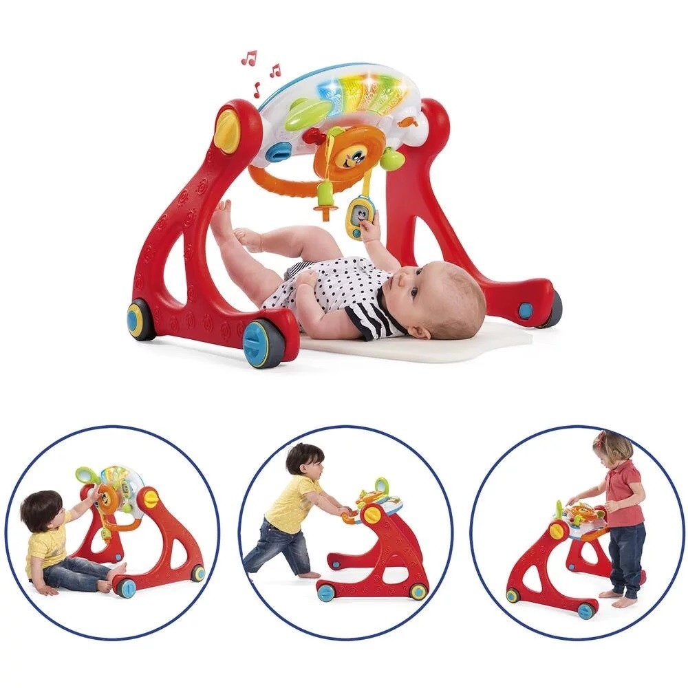 Ginásio Cresce e Caminha da Chicco, um ginásio repleto de atividades práticas, luzes e melodias para ajudar e apoiar o desenvolvimento motor dos bebés (dos 3 meses até cerca dos 3 anos) graças às suas 4 configurações diferentes.