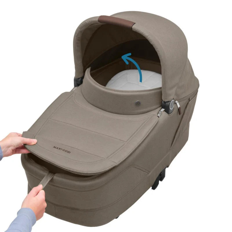 Alcofa premium com inclinação ajustável para recém-nascidos até 6 meses. Design moderno em Twillic Truflle posição plana ergonómica, proteção UPF 50+ e compatível com carrinhos Maxi-Cosi. Promoção Válida de: 06/01/2026 a 28/02/2026