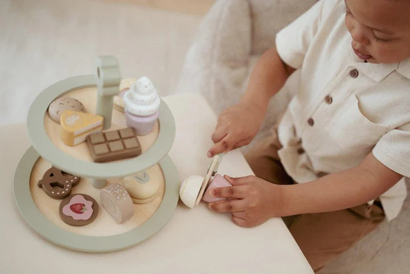 Bandeja de Bolos da Little Dutch em madeira premium. Conjunto perfeito para festas de faz-de-conta, inclui bolos e acessórios coloridos. Estimula o jogo imaginativo e desenvolve competências sociais através de brincadeiras de partilha.