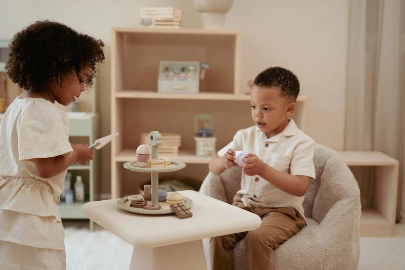 A Bandeja de Bolos da Little Dutch transforma qualquer tarde numa festa encantadora de faz-de-conta. Este conjunto em madeira premium convida as crianças a criar as suas próprias celebrações imaginárias, desenvolvendo competências sociais através da partilha e do jogo criativo.