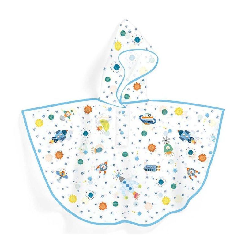Capa de chuva infantil Djeco com design de foguetões para crianças 5-7 anos. Impermeável, colorida e divertida.