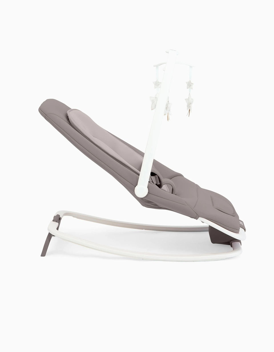 A base pode alternar entre os modos de balanço e de saltitar e é activada pelos movimentos do bebé. O painel de controlo oculto permite-lhe escolher canções de embalar ou sons da natureza para ajudar a acalmar o seu pequenote, bem como a vibração a duas velocidades que ajuda a promover o sono.