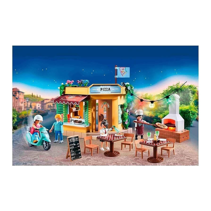 Playmobil City Life - Pizzaria um modelo ideal para iniciar o faz de conta e horas de diversão. Cria as tuas famosas pizzas e refeições deliciosas. Modelo com luzes coloridas e o forno de pedra criam um ambiente relaxante para uma refeição descontraída. Pizzaria movimentada